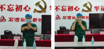 △戚霓虹宣讲七步洗手法和戴脱口罩的方法、注意事项