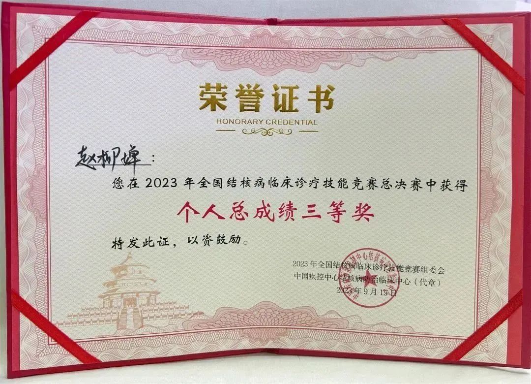 江门市结核病防治所赵柳婵主治医师入选广东队,赴北京参加2023年全国结核病临床诊疗技能竞赛总决赛。经过结核病基础知识、影像诊断、病例分析三场竞逐,赵医生过关斩将、乘风破浪,比赛中荣获“个人总成绩三等奖”。