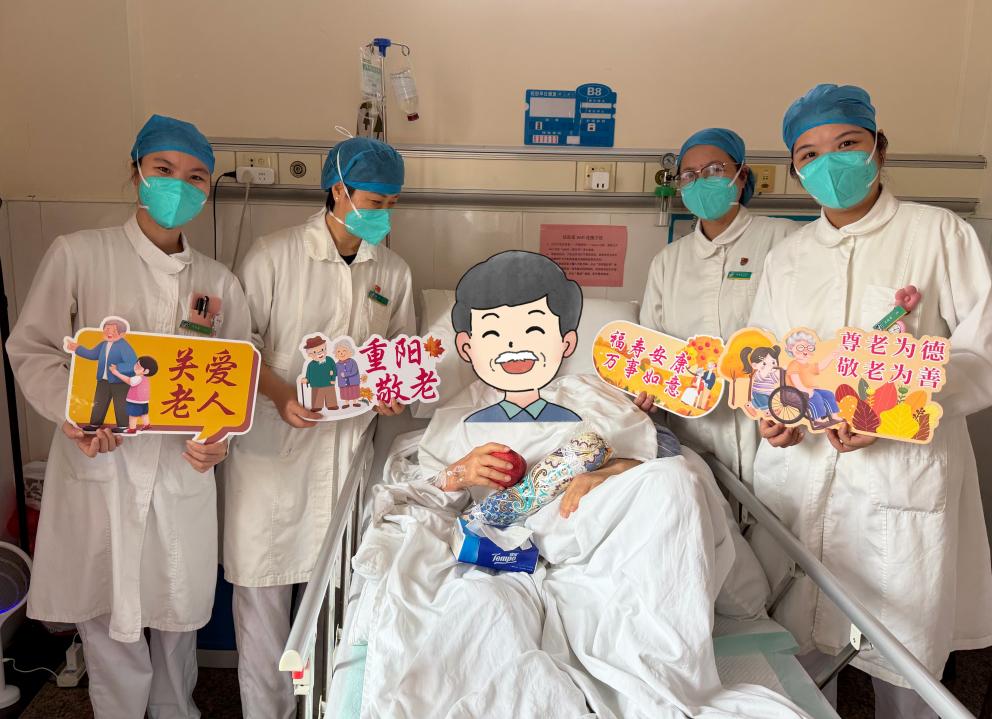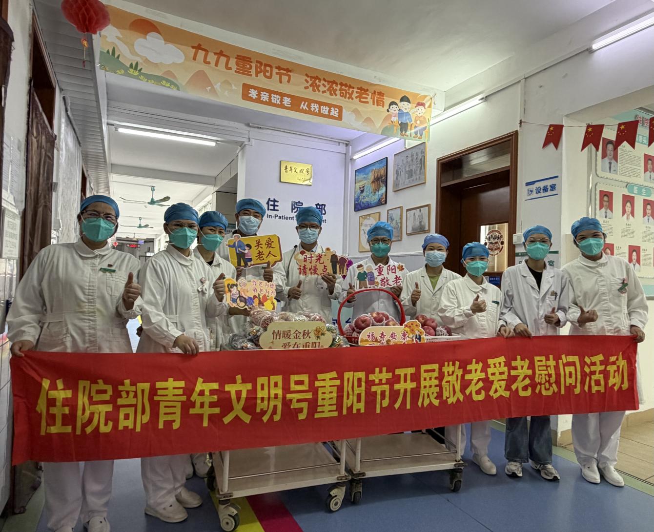 秋来又重阳,情暖老人心。为弘扬中华民族尊老、敬老、爱老、助老的传统美德,在重阳节当日,我所住院部青年文明号的医护人员精心策划并组织了一场以“青春暖重阳,健康伴您行”为主题的重阳节慰问活动,为在院的老年患者们送去节日的祝福与健康的守护。